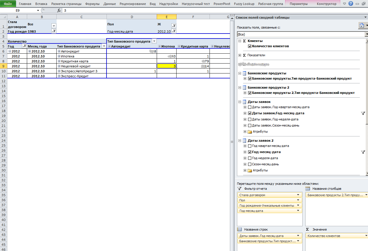Как видно из отчета, за период октябрь-декабрь 2012г. воспользоваться ипотечным кредитом и кредитом на нецелевые нужды изъявили желание 3 женщины 1983 года рождения. Если дважды щелкнуть на ячейке куба, то выполнится операция DRILLTHROUGH (хотя я предпочитаю блокировать ванильную функциональность Excel и предоставлять пользователям детализацию через кастомизированное дополнительное действие (Action), и можно увидеть Ф.И.О. (а также персональные данные) этих клиенток. По причинам конфиденциальности подобный скриншот не публикуется :).