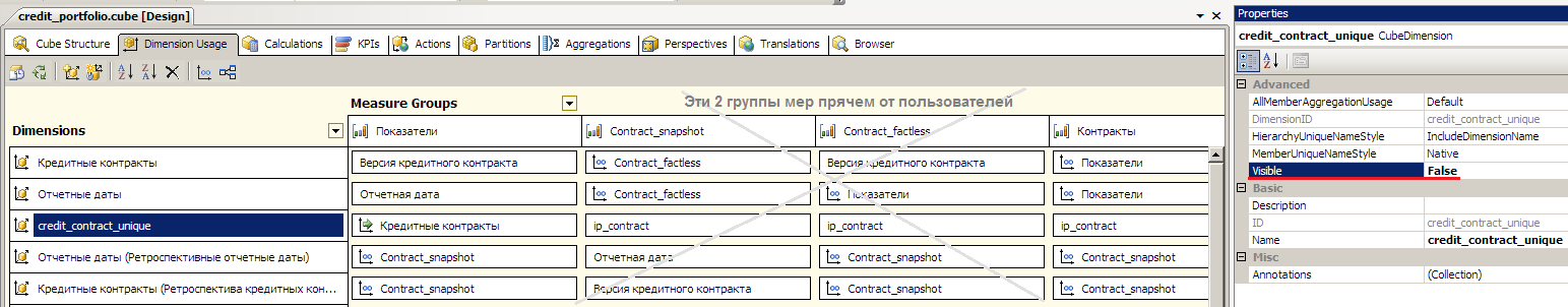 На рисунке ниже я постарался воспроизвести фрагмент матрицы использования измерений работающего куба кредитного портфеля, соблюдая в точности аналогию с примером автора.