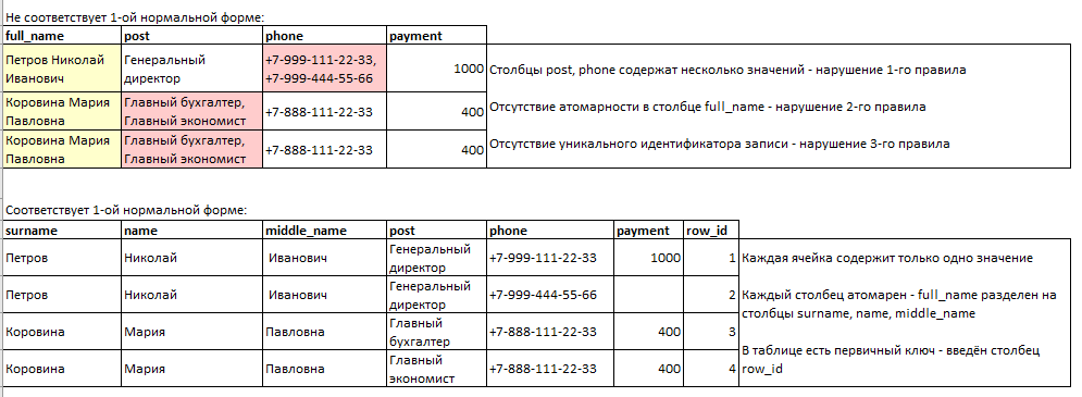 Каждый столбец таблицы должен содержать только одно значение. Недопустимы в одной ячейке таблицы было несколько значений, разделённых каким-то разделителем, недопустима какая-то сложная структура, как то список или массив.