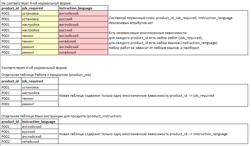 4NF означает, что таблица должна быть в 3NF и не должна содержать независимых многозначных зависимостей. Другими словами: если в таблице есть два или более независимых многозначных атрибута, которые не зависят от первичного ключа друг через друга, то их нужно вынести в отдельные таблицы. Многозначная зависимость возникает, когда один атрибут (или группа атрибутов) связан с набором (множеством) значений другого атрибута, при этом эти наборы не зависят от третьего атрибута.