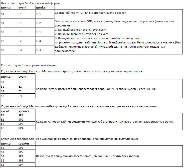 5NF означает, что таблица должна быть в 4NF плюс ещё: нельзя разбить таблицу на более мелкие таблицы без потери информации, а затем восстановить исходную таблицу с помощью естественных соединений (JOIN).