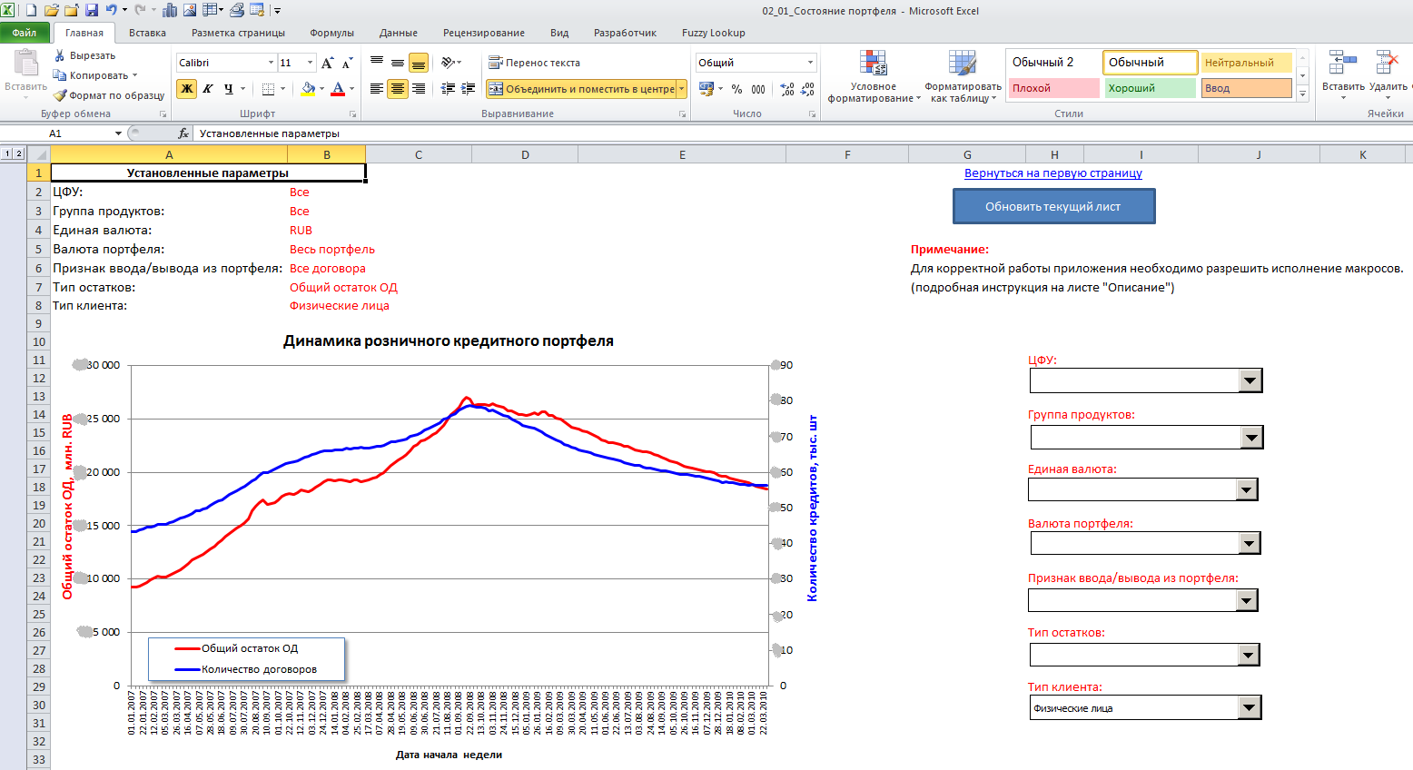 На базе витрины и куба разработан автоматически обновляемый комплекс периодической графической отчетности для осуществления мониторинга рисков розничного кредитования и анализа проблемных точек. Основные отчеты (в различных разрезах):